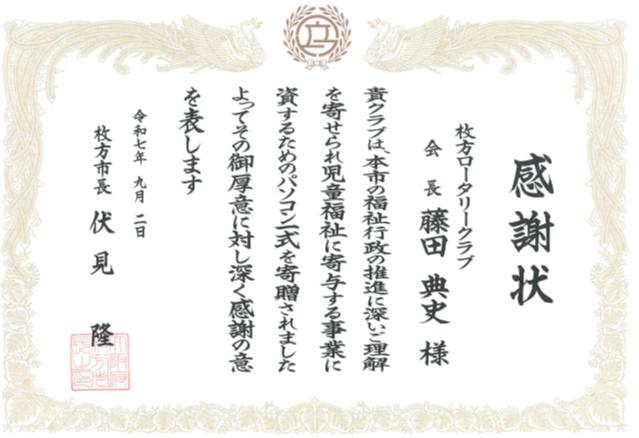 枚方市まるっとこどもセンターへパソコン2台を寄贈し、感謝状をいただきました。